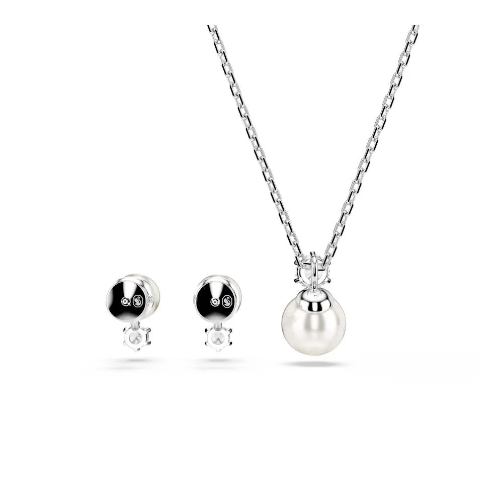 Un conjunto verdaderamente icónico, esta hermosa combinación Matrix incluye un colgante y unos pendientes radiantes. El colgante cuelga de una cadena rodiada y luce una perla de cristal Swarovski blanca y una circonita Swarovski de talla redonda. La misma combinación deslumbrante se revela en cada pendiente. Combínalo con una camiseta y unos vaqueros para un look natural y atractivo.