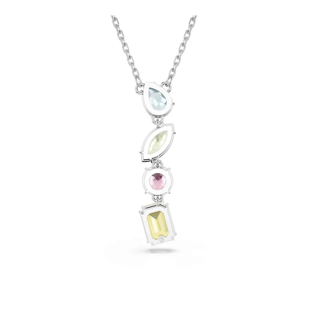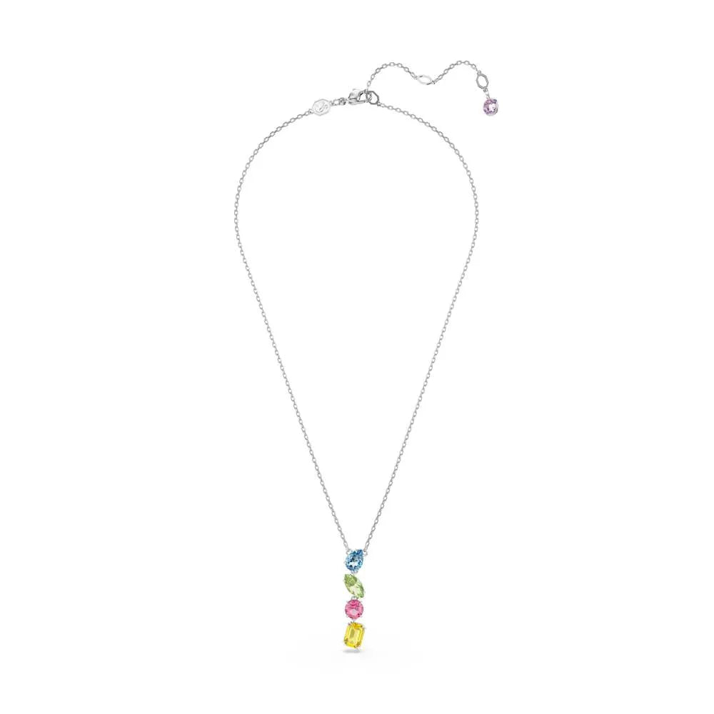 Dale alegría y color a tu estilo. Este cautivador colgante con baño de rodio presenta un conjunto de cristales individuales suspendidos que brillan en los tonos característicos de Swarovski. Su diseño en tonos dulces es brillante, energizante e irresistible. Combina a la perfección con piezas igualmente vibrantes de la familia Gemstone.